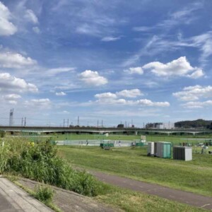 多摩川の真横に位置するバーベキュー場。とにかくロケーションが良い。この大パノラマ!